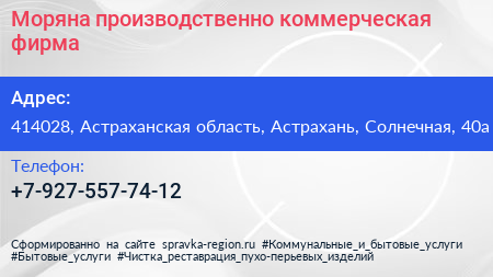 Моряна, производственно-коммерческая фирма по адресу 414028, Астраханская область, Астрахань, Солнечная, 40а в дальнейшем Организация, размещена в следующих категориях: