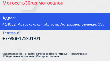 Мотосеть30rus, мотосалон по адресу 414052, Астраханская область, Астрахань, Зелёная, 53а в дальнейшем Организация, размещена в следующих категориях: