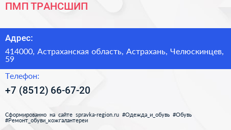 ПМП ТРАНСШИП по адресу 414000, Астраханская область, Астрахань, Челюскинцев, 59 в дальнейшем Организация, размещена в следующих категориях: