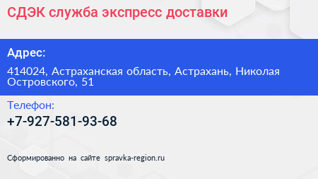 СДЭК, служба экспресс-доставки по адресу 414024, Астраханская область, Астрахань, Николая Островского, 51 в дальнейшем Организация, размещена в следующих категориях:
