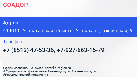СОАДОР по адресу 414011, Астраханская область, Астрахань, Тихвинская, 9 в дальнейшем Организация, размещена в следующих категориях: