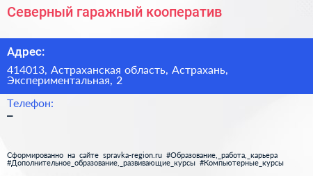 Северный, гаражный кооператив по адресу 414013, Астраханская область, Астрахань, Экспериментальная, 2 в дальнейшем Организация, размещена в следующих категориях: