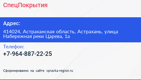 СпецПокрытия по адресу 414024, Астраханская область, Астрахань, улица Набережная реки Царева, 1а в дальнейшем Организация, размещена в следующих категориях: