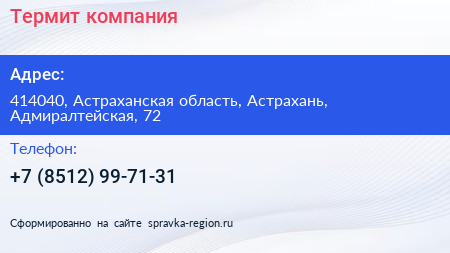 Термит, компания по адресу 414040, Астраханская область, Астрахань, Адмиралтейская, 72 в дальнейшем Организация, размещена в следующих категориях: