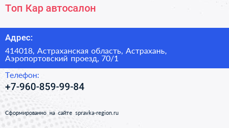 Топ Кар, автосалон по адресу 414018, Астраханская область, Астрахань, Аэропортовский проезд, 70/1 в дальнейшем Организация, размещена в следующих категориях: