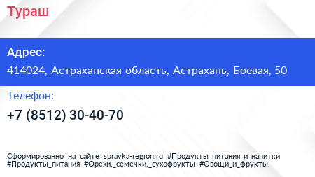 Тураш по адресу 414024, Астраханская область, Астрахань, Боевая, 50 в дальнейшем Организация, размещена в следующих категориях: