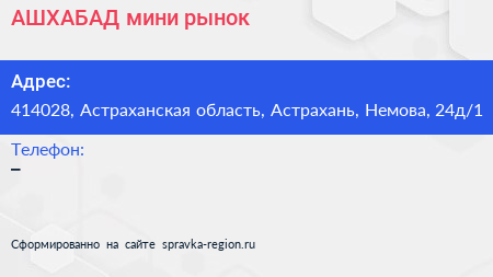 АШХАБАД, мини-рынок по адресу 414028, Астраханская область, Астрахань, Немова, 24д/1 в дальнейшем Организация, размещена в следующих категориях: