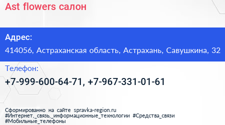 Ast flowers, салон по адресу 414056, Астраханская область, Астрахань, Савушкина, 32 в дальнейшем Организация, размещена в следующих категориях: