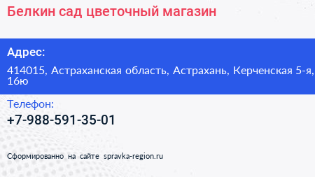 Белкин сад, цветочный магазин по адресу 414015, Астраханская область, Астрахань, Керченская 5-я, 16ю в дальнейшем Организация, размещена в следующих категориях: