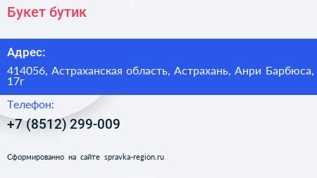 Букет-бутик по адресу 414056, Астраханская область, Астрахань, Анри Барбюса, 17г в дальнейшем Организация, размещена в следующих категориях: