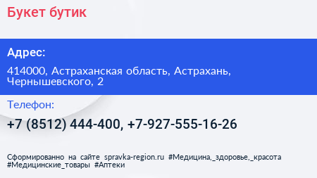 Букет-бутик по адресу 414000, Астраханская область, Астрахань, Чернышевского, 2 в дальнейшем Организация, размещена в следующих категориях: