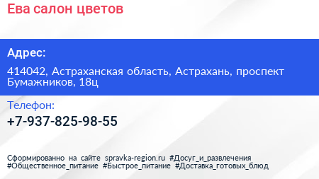 Ева, салон цветов по адресу 414042, Астраханская область, Астрахань, проспект Бумажников, 18ц в дальнейшем Организация, размещена в следующих категориях: