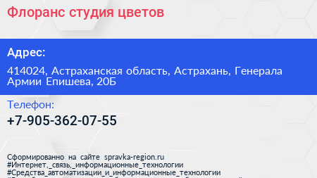 Флоранс, студия цветов по адресу 414024, Астраханская область, Астрахань, Генерала Армии Епишева, 20Б в дальнейшем Организация, размещена в следующих категориях:
