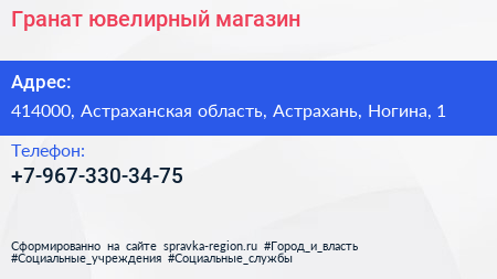 Гранат, ювелирный магазин по адресу 414000, Астраханская область, Астрахань, Ногина, 1 в дальнейшем Организация, размещена в следующих категориях: