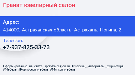 Гранат, ювелирный салон по адресу 414000, Астраханская область, Астрахань, Ногина, 2 в дальнейшем Организация, размещена в следующих категориях: