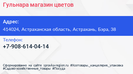 Гульнара, магазин цветов по адресу 414024, Астраханская область, Астрахань, Бэра, 38 в дальнейшем Организация, размещена в следующих категориях: