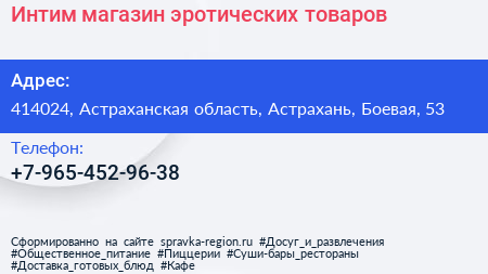 Интим, магазин эротических товаров по адресу 414024, Астраханская область, Астрахань, Боевая, 53 в дальнейшем Организация, размещена в следующих категориях: