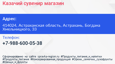 Казачий сувенир, магазин по адресу 414024, Астраханская область, Астрахань, Богдана Хмельницкого, 33 в дальнейшем Организация, размещена в следующих категориях:
