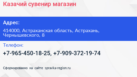 Казачий сувенир, магазин по адресу 414000, Астраханская область, Астрахань, Чернышевского, 8 в дальнейшем Организация, размещена в следующих категориях: