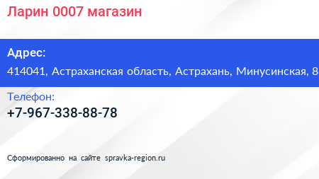 Ларин 0007, магазин по адресу 414041, Астраханская область, Астрахань, Минусинская, 8 в дальнейшем Организация, размещена в следующих категориях: