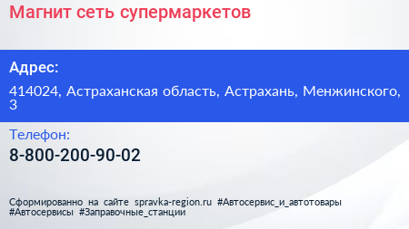 Магнит, сеть супермаркетов по адресу 414024, Астраханская область, Астрахань, Менжинского, 3 в дальнейшем Организация, размещена в следующих категориях: