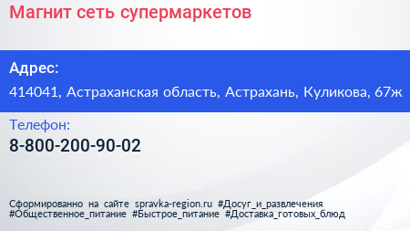 Магнит, сеть супермаркетов по адресу 414041, Астраханская область, Астрахань, Куликова, 67ж в дальнейшем Организация, размещена в следующих категориях:
