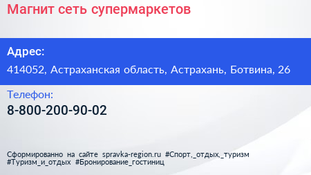 Магнит, сеть супермаркетов по адресу 414052, Астраханская область, Астрахань, Ботвина, 26 в дальнейшем Организация, размещена в следующих категориях: