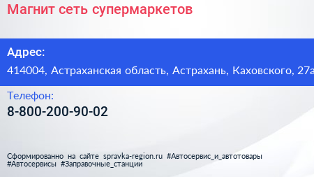 Магнит, сеть супермаркетов по адресу 414004, Астраханская область, Астрахань, Каховского, 27а в дальнейшем Организация, размещена в следующих категориях: