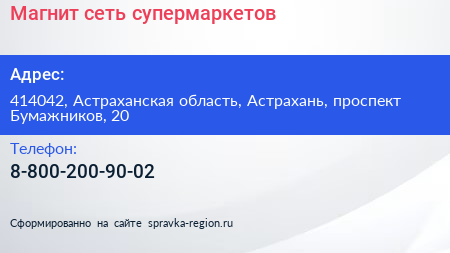 Магнит, сеть супермаркетов по адресу 414042, Астраханская область, Астрахань, проспект Бумажников, 20 в дальнейшем Организация, размещена в следующих категориях: