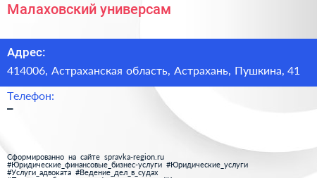 Малаховский, универсам по адресу 414006, Астраханская область, Астрахань, Пушкина, 41 в дальнейшем Организация, размещена в следующих категориях: