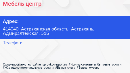 Мебель-центр по адресу 414040, Астраханская область, Астрахань, Адмиралтейская, 51Б в дальнейшем Организация, размещена в следующих категориях: