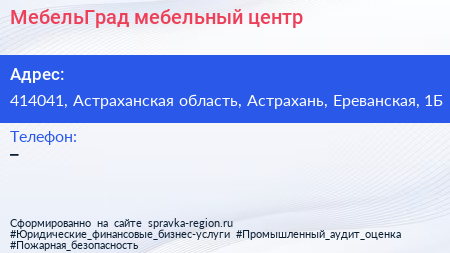 МебельГрад, мебельный центр по адресу 414041, Астраханская область, Астрахань, Ереванская, 1Б в дальнейшем Организация, размещена в следующих категориях: