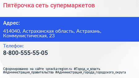 Пятёрочка, сеть супермаркетов по адресу 414040, Астраханская область, Астрахань, Коммунистическая, 23 в дальнейшем Организация, размещена в следующих категориях: