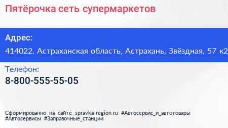 Пятёрочка, сеть супермаркетов по адресу 414022, Астраханская область, Астрахань, Звёздная, 57 к2 в дальнейшем Организация, размещена в следующих категориях: