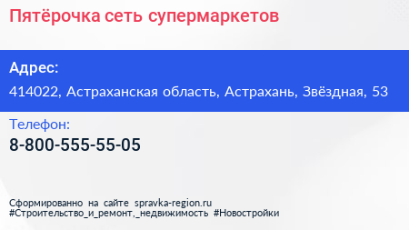 Пятёрочка, сеть супермаркетов по адресу 414022, Астраханская область, Астрахань, Звёздная, 53 в дальнейшем Организация, размещена в следующих категориях: