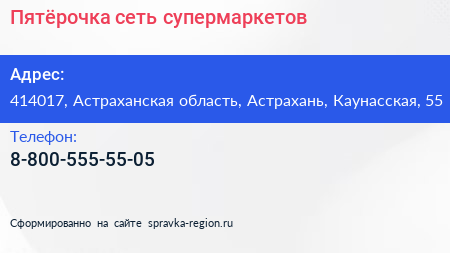 Пятёрочка, сеть супермаркетов по адресу 414017, Астраханская область, Астрахань, Каунасская, 55 в дальнейшем Организация, размещена в следующих категориях: