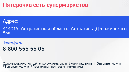 Пятёрочка, сеть супермаркетов по адресу 414015, Астраханская область, Астрахань, Дзержинского, 56в в дальнейшем Организация, размещена в следующих категориях: