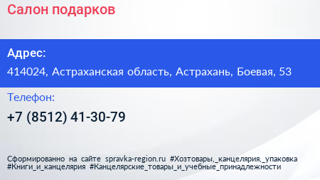Салон подарков по адресу 414024, Астраханская область, Астрахань, Боевая, 53 в дальнейшем Организация, размещена в следующих категориях: