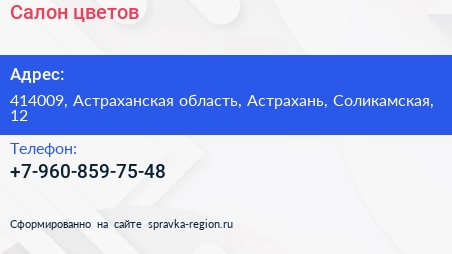 Салон цветов по адресу 414009, Астраханская область, Астрахань, Соликамская, 12 в дальнейшем Организация, размещена в следующих категориях: