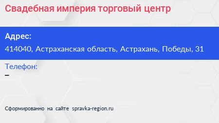 Свадебная империя, торговый центр по адресу 414040, Астраханская область, Астрахань, Победы, 31 в дальнейшем Организация, размещена в следующих категориях: