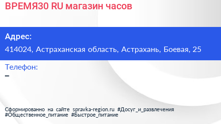 ВРЕМЯ30.RU, магазин часов по адресу 414024, Астраханская область, Астрахань, Боевая, 25 в дальнейшем Организация, размещена в следующих категориях: