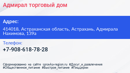 Адмирал, торговый дом по адресу 414018, Астраханская область, Астрахань, Адмирала Нахимова, 139а в дальнейшем Организация, размещена в следующих категориях: