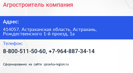Агростроитель, компания по адресу 414057, Астраханская область, Астрахань, Рождественского 1-й проезд, 1а в дальнейшем Организация, размещена в следующих категориях: