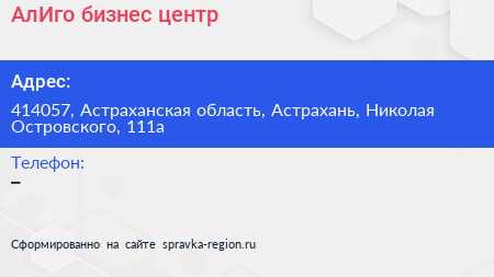 АлИго, бизнес-центр по адресу 414057, Астраханская область, Астрахань, Николая Островского, 111а в дальнейшем Организация, размещена в следующих категориях: