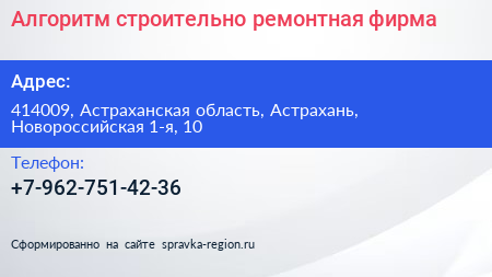 Алгоритм, строительно-ремонтная фирма по адресу 414009, Астраханская область, Астрахань, Новороссийская 1-я, 10 в дальнейшем Организация, размещена в следующих категориях: