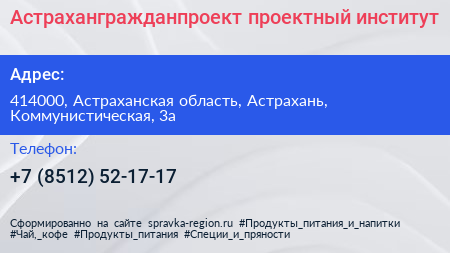 Астрахангражданпроект, проектный институт по адресу 414000, Астраханская область, Астрахань, Коммунистическая, 3а в дальнейшем Организация, размещена в следующих категориях: