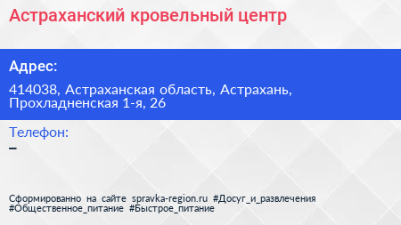 Астраханский кровельный центр по адресу 414038, Астраханская область, Астрахань, Прохладненская 1-я, 26 в дальнейшем Организация, размещена в следующих категориях:
