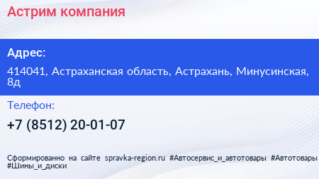 Астрим, компания по адресу 414041, Астраханская область, Астрахань, Минусинская, 8д в дальнейшем Организация, размещена в следующих категориях: