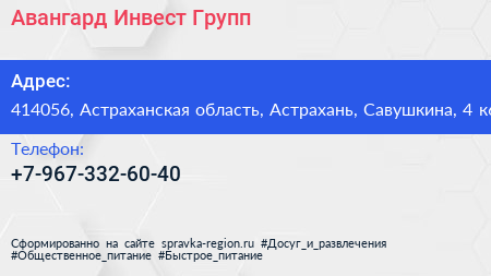 Авангард Инвест Групп по адресу 414056, Астраханская область, Астрахань, Савушкина, 4 к6 в дальнейшем Организация, размещена в следующих категориях: