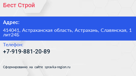 Бест-Строй по адресу 414041, Астраханская область, Астрахань, Славянская, 1 лит24Б в дальнейшем Организация, размещена в следующих категориях: